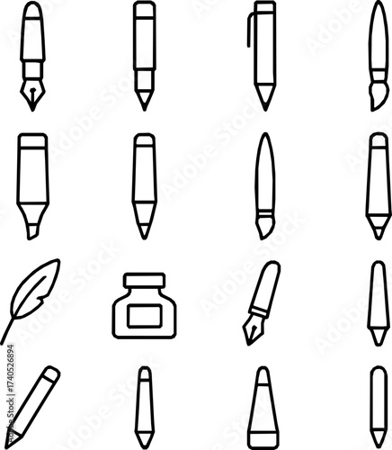 fountain pen, mechanical pencil, marker, brush, calligraphy, ball pen, highlighter, stylus, wax crayons, chalk, quill, icon, vector, set, symbol