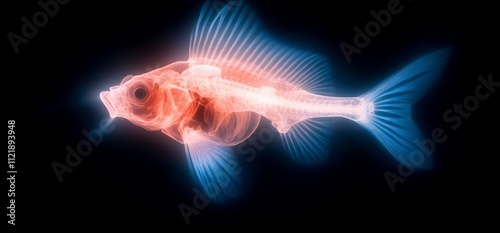 fish, x-ray, skeleton, anatomy, biology, aquatic, underwater, vertebrate, marin, animal, nature, wildlife, science, research, ocean, sea, fin, tail, bone, organ, body, red, blue, dark, background, glow, light, image, photo, picture, illustration, graphic, design, abstract, art, texture, pattern, detail, closeup, view, vibrant, colourful, transparent, structure, shape, form, specimen