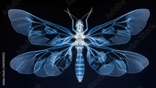 X-ray-like image of a delicate insect with large, detailed wings against a black background