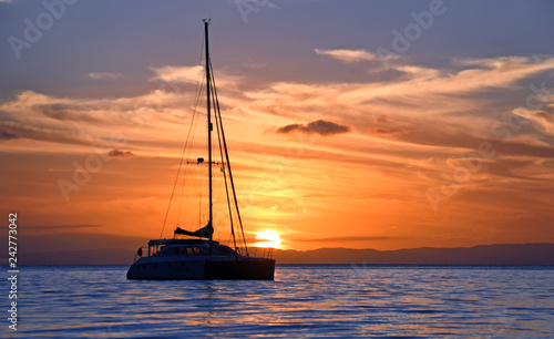 sail, boat, sailboat, yacht, catamaran, vessel, sunset, dusk, sun, dawn, sunrise, cloud, bay, ocean, sea, tranquil, water, graceful, pretty