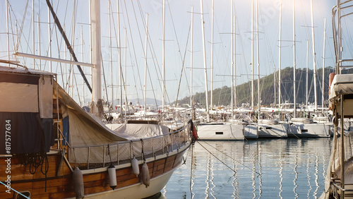 Yachts and boats moor on pier at sunny day. Yacht parking. Luxury marina view