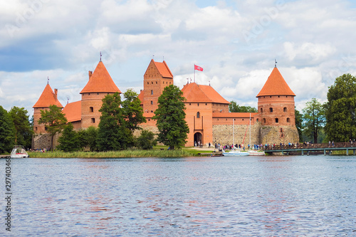 Yachts and medieval gothic Trakai Island Castle with stone walls and towers with red tiled roofs in lake Galve, Lithuania. Trakai Castle is one of major tourist attractions of Lithuania