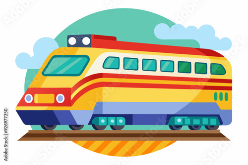 train, yellow, red, track, railway, blue, green, white, cloud, sky, transportation, locomotive, wheel, brown, striped, passenger, carriage, travel, journey, railroad, infrastructure, fast, modern, sleek, engine, metal, steel, window, door, light, front, side, back, flat, illustration, graphic, design, cartoon, icon, symbol, digital