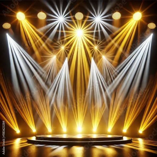 Yellow and white spotlights illuminate stage floor in a dark room, creating a dynamic and visually striking backdrop that is perfect for generating creative ideas and setting stage for a captivating p