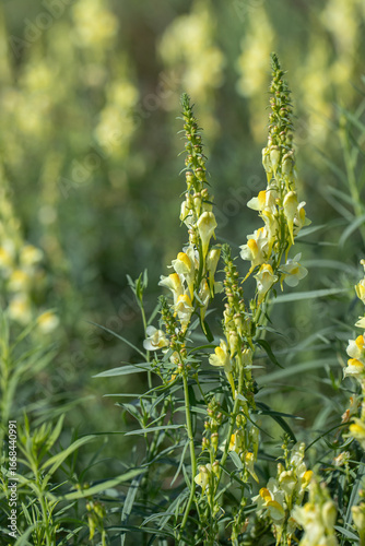 Yellow blossoms of the butter-and-eggs flower (Linaria vulgaris) in a meadow.