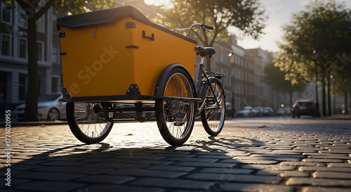 Yellow cargo bicycle on cobblestone street yellow box