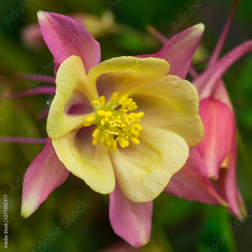 anther, aquilegia, bloom, closeup, closeup, filament, flora, flower, macro, nature, pink, pink flower, pistil, plant, pollen, spring, springtime, square, stamen, stigma, yellow, yellow flower