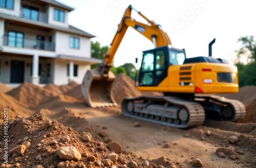 Yellow Excavator digging the soil at Construction Site, outdoors. Special Professional Machine for Construction Works and laying earth