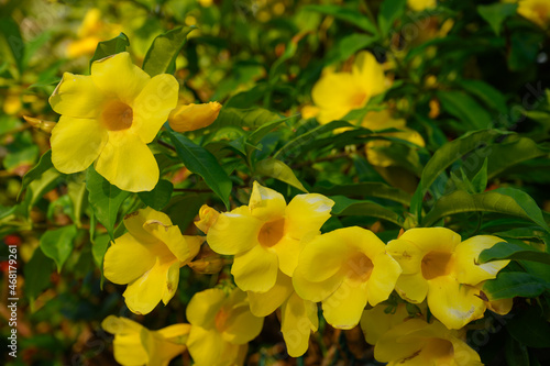 yellow flower blossom exotic garden shrub summer. Photo of a yellow flower taken in the jungle of the Dominican Republic just after the rain. The photo was taken in natural conditions in early morning