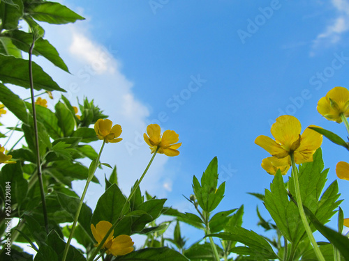 Yellow flowers against the blue sky. Look below. Natural floral background