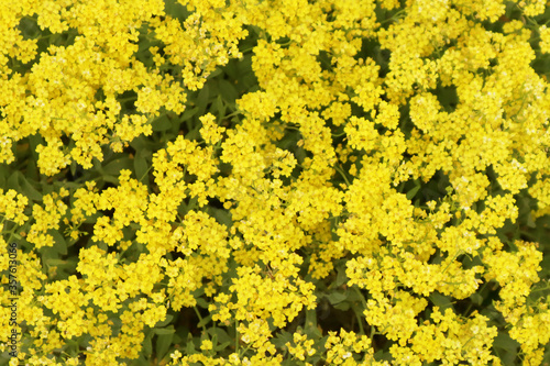 Yellow flowers texture. Background for design postcards or layout. Close-up, top view.
