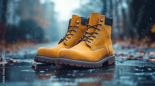 boot, yellow, leather, rain, autumn, fall, wet, puddle, footwear, water, season, cold, weather, style, fashion, clothing, apparel, lace, lace, street, ground, city, urban, texture, detail, damp, pair, shoe, comfort, protection, hard-wearing, stylish, classic, vintage, robust, accurateness, winter, travel, hiking