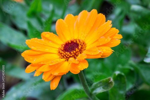 yellow medicinal calendula flower with raindrops or dew. on a blurred background with bokeh. macro photo of a flower. screensaver. free space. close-up.