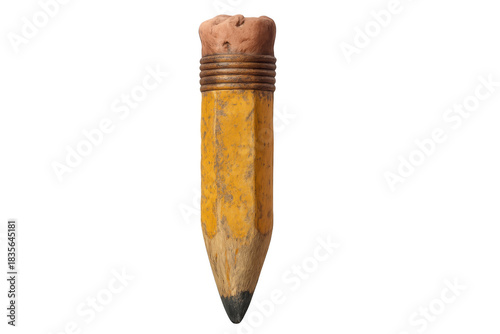 Yellow pencil, short and well-used, showing a worn eraser and sharpened graphite tip, isolated on a transparent background
