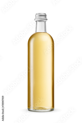 Yellow soda in glass bottle closed with aluminum screw cap isolated. Transparent PNG image.