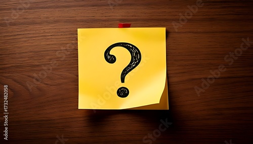 Yellow sticky note with question mark on wooden surface