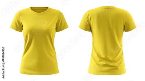 t-shirt, shirt, clothing, apparel, fashion, garment, textile, fabric, yellow, colours, bright, vibrant, front, view, back, template, design, blank, plain, casual attire, top, crew, neck, short, sleeve, unisex, isolated
