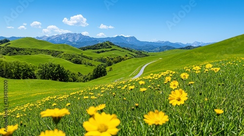 Yellow Wildflowers and Rolling Green Hills Under Blue Sky