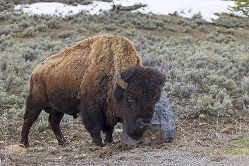 Yellowstone bison rubbing up against a rock