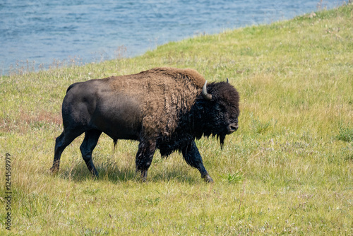 Yellowstone National Park, Wyoming, USA. Wet bison after swimming in the Yellowstone River.