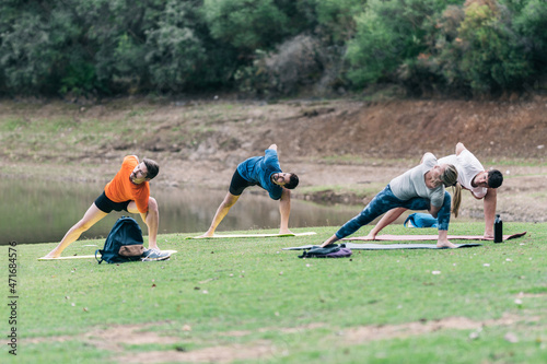 Yoga instructor leading a yoga class in a park
