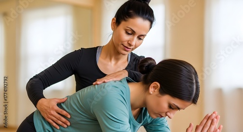 Yoga instructor provides gentle hands-on assistance to a woman for correct posture