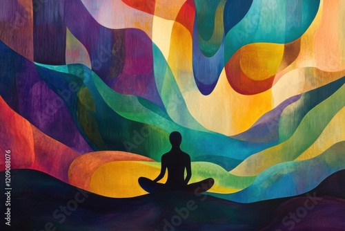 Yoga practitioner in a serene setting, utilizing vibrant colors and dynamic shapes to enhance depth and perspective