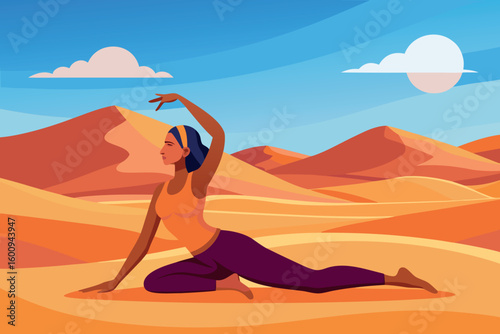 Yoga stretches at sunset in a tranquil desert landscape with golden sand dunes
