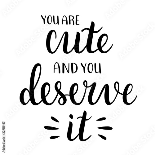 You are cute and you deserve it, positive lettering quote, handwritten saying, typography banner with inspiratinal writing, good as greeting card, poster