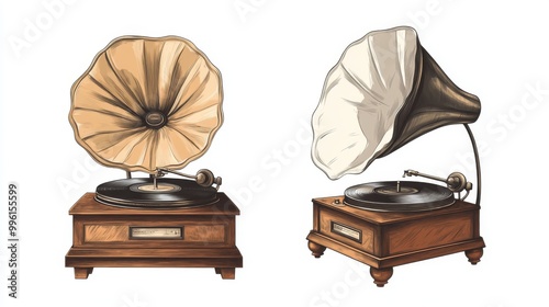 You can get a vector image of a gramophone in two colors. The gramophone is an old-fashioned record player. It's a classic, antique design from the 90s.