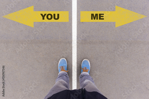 You or Me text arrows on asphalt ground, feet and shoes on floor