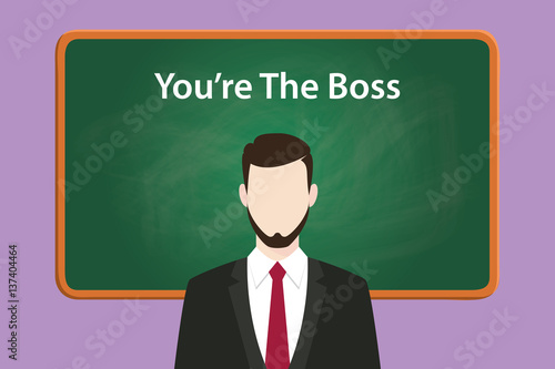 you re the boss white text on chalk board illustration with bearded man wearing black suit standing in front of green chalk board