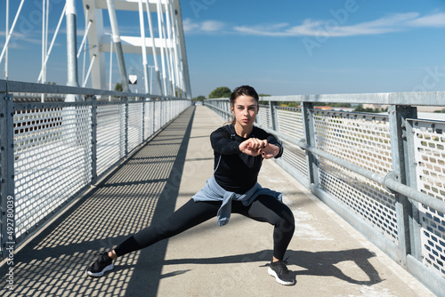 Young active sporty business woman morning routine of stretching and running exercising outdoor before she go to the work at office. Self loved female fitness workout training for healthy life.