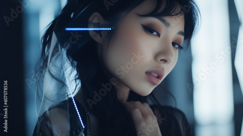 young adult asian woman, research and technology, abstract fictional scene, holographic displays