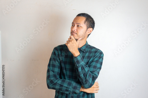 Young Adult bearded Asian man wearing green flannel shirt showing thinking gesture. Hip on chin