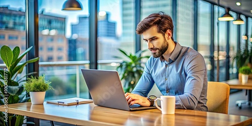 Young adult male working on laptop in modern office environment showcasing business lifestyle technology