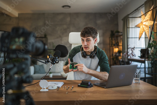man, technology, podcast, earphones, web log, recording, young men, microphone, laptop, camera, electronic, demonstration, creativity, innovation, communication, digital, tutorial, education, learning, modern, engaging, interactive, cyberspace, broadcast, expression, workspace, headset, lifestyle, light, interior, contemporary, audio equipment, demonstrate, explain, male, 1, young, adult, caucasian, copy space