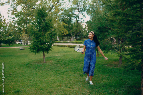 Young adult woman playing badminton in the park.