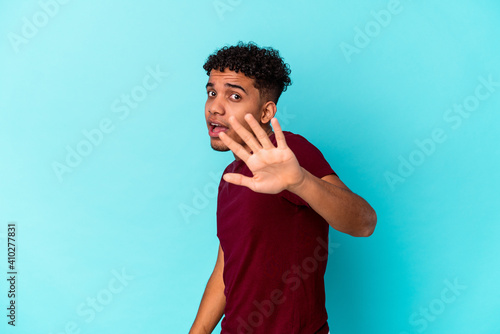 Young african american curly man isolated on blue being shocked due to an imminent danger