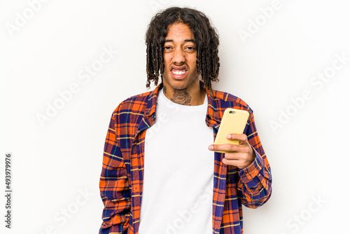 Young African American man holding mobile phone isolated on white background screaming very angry and aggressive.