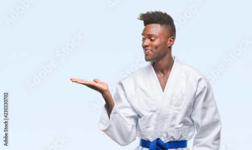 afro, black, american, young, adult, african, man, portrait, isolated, background, karate, kimono, martial, belt, fighter, sport, fight, training, exercise, uniform, showing, presenting, hand, gesture, person, happy, space, palm, welcome, people, product, advertisement, presentation, smile, advertising, copy space, cheerful, gesticulate, looking, arm, smiling, pointing, something, signs, business, show, displaying, display, promoting, confident