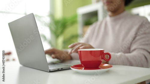 Young african american woman using laptop sitting on table at home