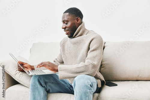 man, laptop, sweater, sofa, home, productivity, happiness, living room, engagement, comfort, african, modern, cosy, lifestyle, joy, minimalist, technology, workspace, youth, smile, casual attire, indoor, connection, design, fashion, relaxation, contemporary, private, cheerful, conversation, personal, digital, home office, study, leisure, working, content, vibe, natural light, comfortable, smiling, friendly, casual clothes, environment, creativity