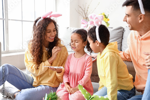 Young African-American woman painting her little daughter's face at home on Easter day