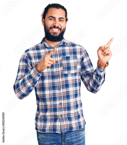 Young arab man wearing casual clothes smiling and looking at the camera pointing with two hands and fingers to the side.