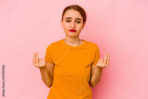 person, girl, female, isolated, portrait, woman, young, attractive, beauty, pretty, adult, cute, lifestyle, studio, white, casual attire, business, muslim, arab, indian, mixed race, pink, background, model, face, misery, money, no, poor, gesture, poverty, desperate, finger, help, concept, charity, donation, assistance, ruined, expression, sad, problem, bad, support