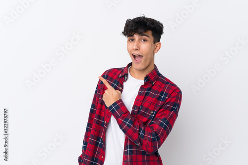 man, man, people, person, male, guy, studio, photogenic, young, adult, caucasian, background, wall, isolated, white, blank, pointing, side, surprise, finger, looking, showing, portrait, hand, shock, space, point, gesture, copy, signs, direction, look, expression, right