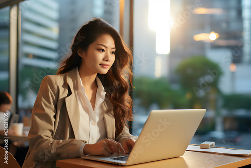 Young Asian business woman a professional marketing sales manager using laptop with city view in day time