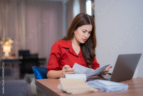 Young Asian businesswoman having problems with domestic bills, checking financial documents, using laptop and calculating domestic expenses sitting at home office desk