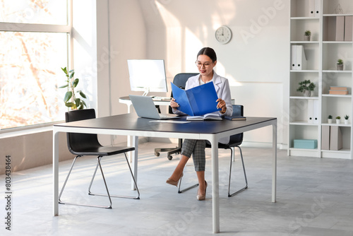 Young Asian businesswoman with folder working at table in office